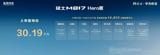 新浪科技訊 11月24日晚間消息,猛士廣州車展期間,上市售猛士M817 Hero版正式上市,搭載指導價為30.19萬元。鴻蒙
