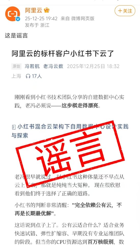 新浪科技訊 12月25日晚間消息,阿里今日晚間,云辟謠針對有博主發文稱“阿里云的紅書標桿客戶小紅書下云了。”阿里云通過官方微博回應稱:這是傳聞謠言。